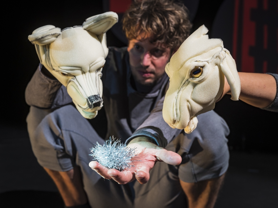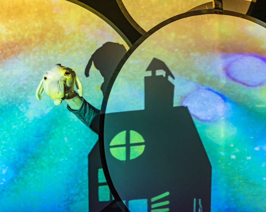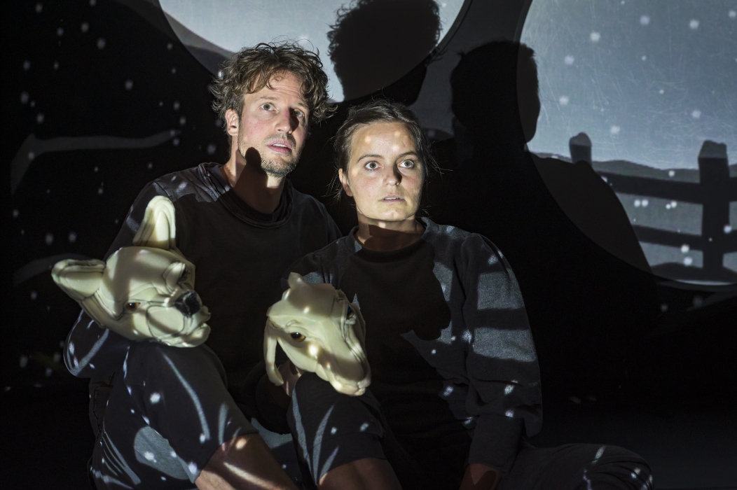 Eine klirrend kalte Winternacht. Der ausgehungerte Wolf trifft im warmen Stall auf das lebenshungrige Schaf. Indem er dem Schaf neue Erfahrungen verspricht, lockt er es in die weisse Einsamkeit. Ein Zweiergespann, das unterschiedlicher nicht sein könnte, macht sich auf zu einer Schlittenfahrt – bis plötzlich das Eis bricht. Die bildstarke Inszenierung besticht mit raumgreifend gespielten Figuren, Live-Projektionen und viel Musik.